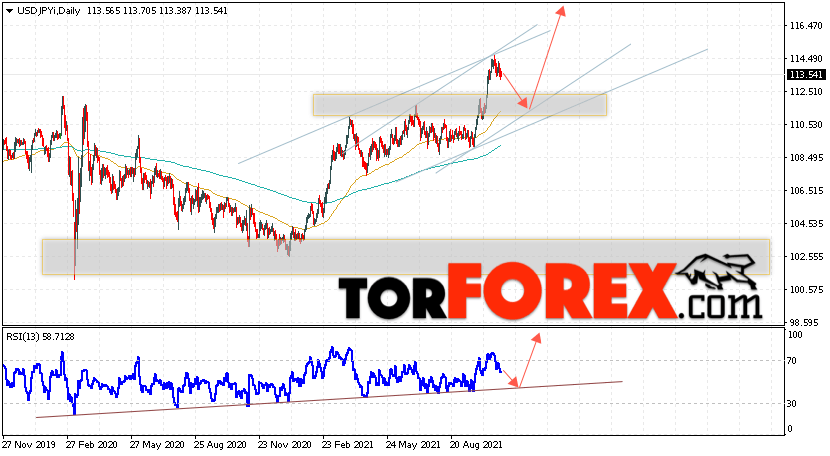 Дополнительным сигналом в пользу подъёма пары Доллар Иена на текущий торговой неделе выступит тест восходящей линии тренда на индикаторе относительной силы. Вторым сигналом станет отскок от нижней границы бычьего канала. Отменой варианта подъёма пары USD/JPY на текущей торговой неделе 1 — 5 ноября 2021 выступит падение и пробой области 109.35. Такой вариант укажет на пробой области поддержки и продолжение падения пары на Форекс в область ниже уровня 105.45. Подтверждением подъёма по паре USD/JPY выступит пробой области сопротивления и закрытие цены над уровнем 116.45.