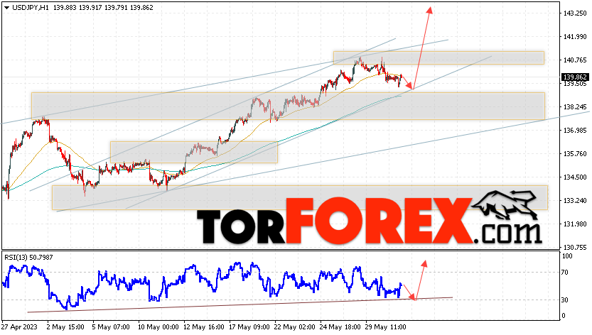 Котировки валютной пары Доллар Иена USD/JPY продолжают движение в рамках роста и бычьего канала. В момент публикации прогноза курс Доллара США к Японской Иене составляет 139.86. Скользящие средние указывают на наличие краткосрочной бычьей тенденции по паре. Цены вновь тестируют область между сигнальными линиями, что указывает на давление со стороны покупателей Доллара США и потенциальное продолжение роста цен уже с текущих уровней. В рамках прогноза курса Японской Иены на 1 июня 2023 стоит ожидать попытку развития коррекции цены и тест области поддержки вблизи уровня 139.35. Далее, отскок цены вверх и продолжение роста пары USD/JPY в область выше уровня 143.45.