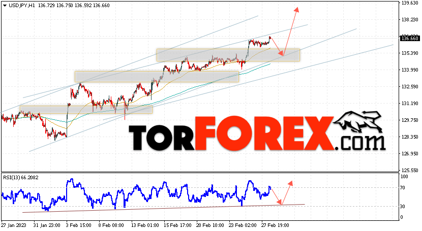 Котировки валютной пары Доллар Иена USD/JPY продолжают движение в рамках роста и бычьего канала. В момент публикации прогноза курс Доллара США к Японской Иене составляет 136.66. Скользящие средние указывают на наличие краткосрочной бычьей тенденции по паре. Цены ушли вверх от области между сигнальными линиями, что указывает на давление со стороны покупателей Доллара США и потенциальное продолжение роста цен уже с текущих уровней. В рамках прогноза курса Японской Иены на 1 марта 2023 стоит ожидать попытку развития снижения и тест области поддержки вблизи уровня 135.25. Далее, отскок цены вверх и продолжение роста пары USD/JPY в область выше уровня 140.65.