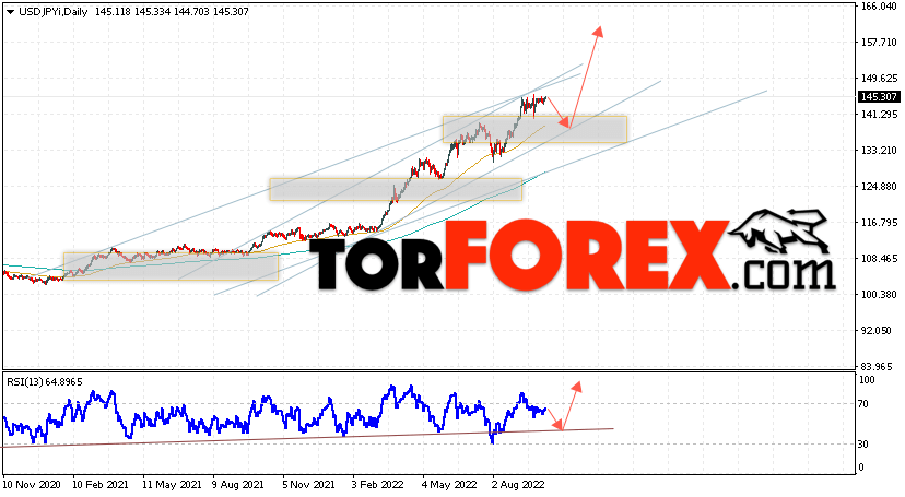 Дополнительным сигналом в пользу роста пары Доллар Иена на текущий торговой неделе выступит тест бычьей линии тренда на индикаторе относительной силы. Вторым сигналом станет отскок от нижней границы бычьего канала. Отменой варианта подъёма пары USD/JPY на текущей торговой неделе 10 — 14 октября 2022 выступит падение и пробой области 133.05. Такой вариант укажет на пробой области поддержки и продолжение падения пары на Форекс в область ниже уровня 127.65. Подтверждением росту по паре USD/JPY выступит пробой области сопротивления и закрытие цены над уровнем 147.65.