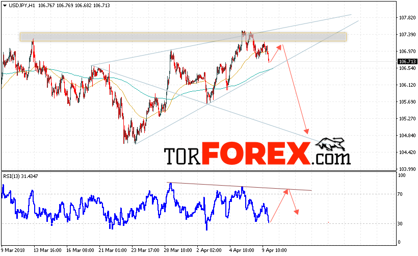 Таким образом, USD/JPY прогноз Доллар Иена на 10 апреля 2018 предполагает попытку теста уровня сопротивления вблизи области 107.20 и продолжения падения котировок в область ниже уровня 105.00, в пользу падения выступит тест линии сопротивления на индикаторе относительной силы, отменой варианта падения станет сильный рост и пробой области 108.10.