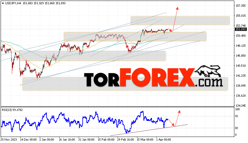 Котировки валютной пары Доллар Иена USD/JPY продолжают движение в рамках развития роста и бычьего. В момент публикации прогноза курс Доллара США к Японской Иене составляет 151.89. Скользящие средние указывают на наличие краткосрочной бычьей тенденции по паре. Цены пробили область между сигнальными линиями вверх, что указывает на давление со стороны покупателей Доллара США и потенциальное продолжение роста цен уже с текущих уровней. В рамках прогноза курса Японской Иены на 10 апреля 2024 стоит ожидать попытку развития коррекции цены и тест области поддержки вблизи уровня 150.75. Далее, отскок цены вверх и продолжение роста пары USD/JPY в область выше уровня 157.35.