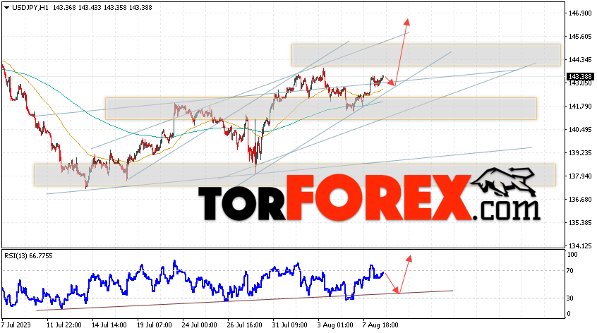Котировки валютной пары Доллар Иена USD/JPY продолжают движение в рамках роста и бычьего канала. В момент публикации прогноза курс Доллара США к Японской Иене составляет 143.38. Скользящие средние указывают на наличие краткосрочной бычьей тенденции по паре. Цены пробили область между сигнальными линиями вверх, что указывает на давление со стороны покупателей Доллара США и потенциальное продолжение роста цен уже с текущих уровней. В рамках прогноза курса Японской Иены на 10 августа 2023 стоит ожидать попытку развития коррекции цены и тест области поддержки вблизи уровня 142.85. Далее, отскок цены вверх и продолжение роста пары USD/JPY в область выше уровня 146.35.