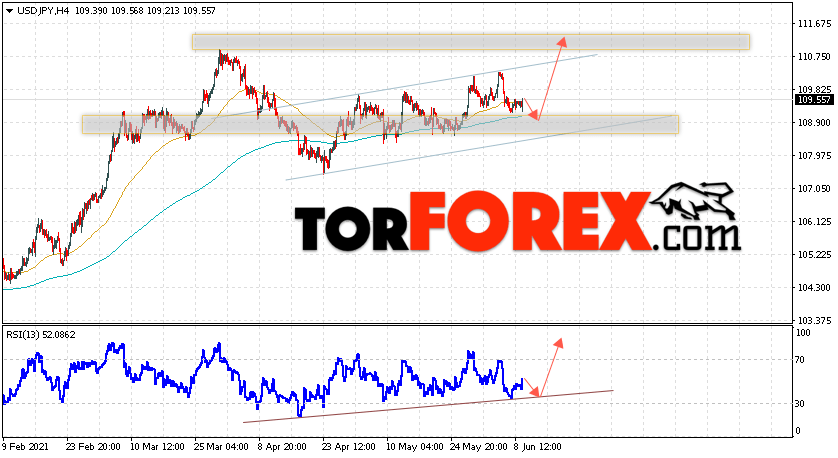 Котировки валютной пары Доллар Иена USD/JPY продолжают движение в рамках падения и восходящего канала. В момент публикации прогноза курс Доллара США к Японской Иене составляет 109.55. Скользящие средние указывают на наличие краткосрочной бычьей тенденции по паре. Цены тестируют область между сигнальными линиями, что указывает на давление со стороны покупателей Доллара США и потенциальное продолжение роста цен уже с текущих уровней. В рамках прогноза курса Японской Иены на 10 июня 2021 стоит ожидать попытку развития коррекции и тест области поддержки вблизи уровня 108.95. Далее, отскок и продолжение роста пары USD/JPY в область выше уровня 110.95.