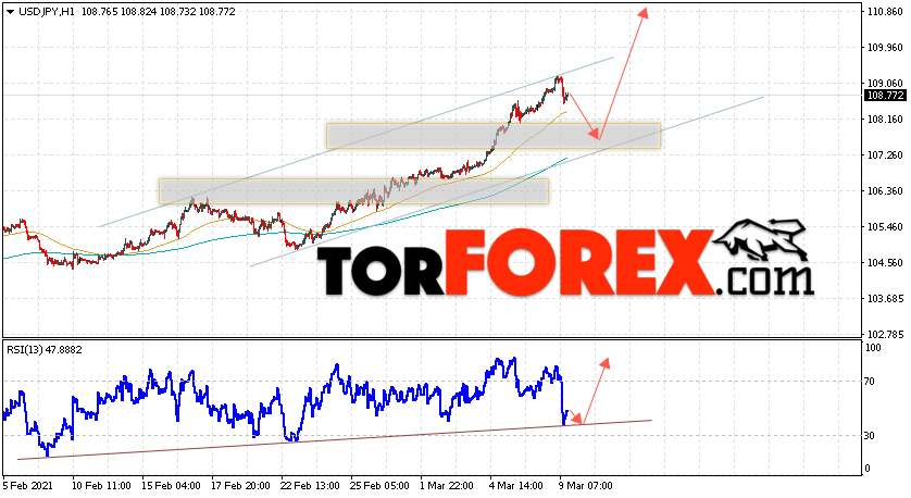 Котировки валютной пары Доллар Иена USD/JPY продолжают движение в рамках роста и восходящего канала. В момент публикации прогноза курс Доллара США к Японской Иене составляет 108.77. Скользящие средние указывают на наличие краткосрочной бычьей тенденции по паре. Цены ушли вверх от области между сигнальными линиями, что указывает на давление со стороны покупателей Доллара США и потенциальное продолжение подъёма цен уже с текущих уровней. В рамках прогноза курса Японской Иены на 10 марта 2021 стоит ожидать попытку развития коррекции и тест области поддержки вблизи уровня 107.55. Далее, отскок и продолжение подъёма пары USD/JPY в область выше уровня 110.95.