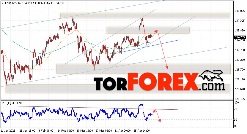 Таким образом, USD/JPY прогноз Доллар Иена на 10 мая 2023 предполагает попытку теста области сопротивления вблизи уровня 135.85. Затем, продолжение падения котировок в область ниже уровня 129.75. В пользу подъёма пары выступит тест линии тренда на индикаторе относительной силы. Отменой варианта падения станет сильный рост и пробой области 137.55. Это укажет на пробой уровня сопротивления и продолжение роста по паре с потенциальной целью выше уровня 139.85.