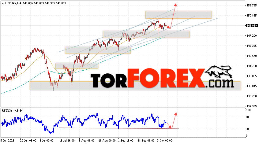 Котировки валютной пары Доллар Иена USD/JPY продолжают движение в рамках развития подъёма и бычьего канала. В момент публикации прогноза курс Доллара США к Японской Иене составляет 149.05. Скользящие средние указывают на наличие краткосрочной бычьей тенденции по паре. Цены ушли вверх от области между сигнальными линиями, что указывает на давление со стороны покупателей Доллара США и потенциальное продолжение роста цен уже с текущих уровней. В рамках прогноза курса Японской Иены на 10 октября 2023 стоит ожидать попытку развития коррекции цены и тест области поддержки вблизи уровня 148.65. Далее, отскок цены вверх и продолжение роста пары USD/JPY в область выше уровня 153.05.