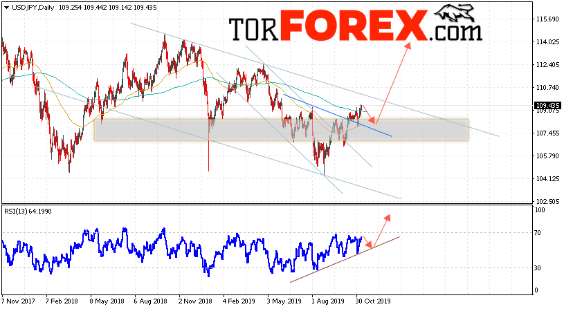 В пользу подъёма пары Доллар Иена выступит тест линии поддержки на индикаторе относительной силы. Вторым сигналом станет отскок от линии «Шеи» разворотной модели «Голова и плечи». Отменой варианта роста пары USD/JPY на текущей торговой неделе 11 — 15 ноября 2019 выступит падение и пробой области 105.95. Такой вариант укажет на пробой области поддержки и продолжение снижения пары на Форекс в область ниже уровня 103.45. Подтверждением роста по паре USD/JPY выступит пробой верхней границы нисходящего канала и закрытие над уровнем 110.85.