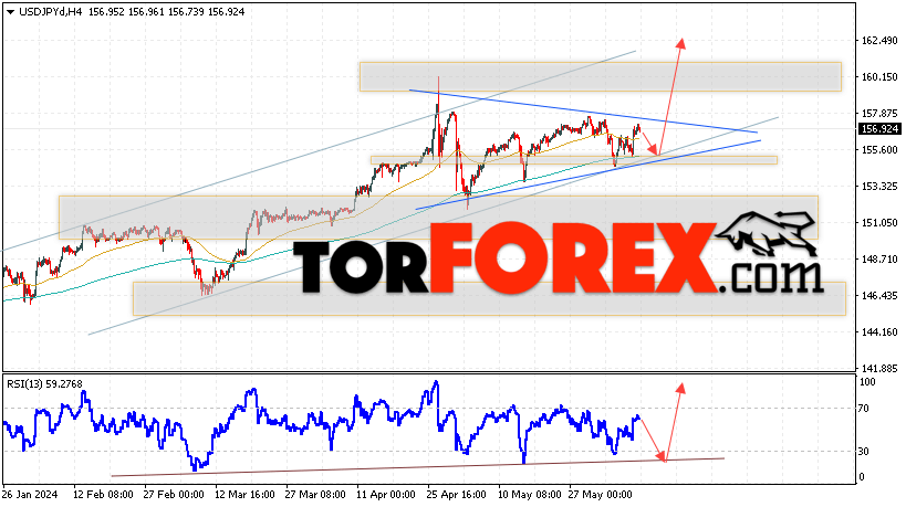 Дополнительным сигналом в пользу подъёма валютной пары USD/JPY выступит тест линии поддержки на индикаторе относительной силы. Вторым сигналом станет отскок от нижней границы бычьего канала. Отменой варианта роста валютной пары Доллар Иена станет падение и пробой уровня 154.25. Это укажет на пробой области поддержки и продолжение падения валютной пары Доллар Иена. В этом случае стоит ожидать продолжения снижения пары в область ниже уровня 151.85. Ожидать подтверждения росту цены стоит с пробоем уровня сопротивления и закреплением цены выше области 158.45, что укажет на пробой верхней границы модели «Треугольник» и начало отработки паттерна с целями вверху.