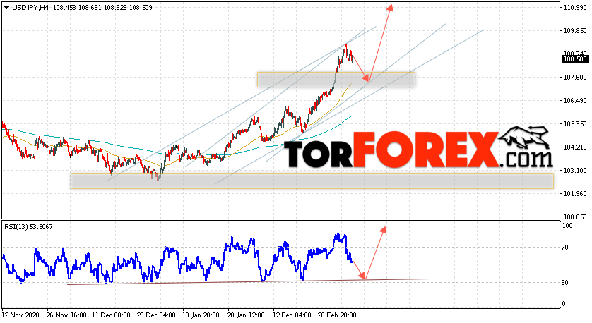 Котировки валютной пары Доллар Иена USD/JPY продолжают движение в рамках роста и восходящего канала. В момент публикации прогноза курс Доллара США к Японской Иене составляет 108.50. Скользящие средние указывают на наличие краткосрочной бычьей тенденции по паре. Цены ушли вверх от области между сигнальными линиями, что указывает на давление со стороны покупателей Доллара США и потенциальное продолжение подъёма цен уже с текущих уровней. В рамках прогноза курса Японской Иены на 11 марта 2021 стоит ожидать попытку развития коррекции и тест области поддержки вблизи уровня 107.55. Далее, отскок и продолжение подъёма пары USD/JPY в область выше уровня 111.05.