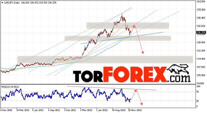 Дополнительным сигналом в пользу снижения пары Доллар Иена на текущий торговой неделе выступит тест линии тренда на индикаторе относительной силы. Вторым сигналом станет отскок от верхней границы разворотной модели ”Голова и плечи”. Отменой варианта снижения пары USD/JPY на текущей торговой неделе 12 — 16 декабря 2022 выступит сильный рост и пробой области 145.75. Такой вариант укажет на пробой области сопротивления и продолжение роста пары на Форекс в область выше уровня 148.45. Подтверждением падению по паре USD/JPY выступит пробой области поддержки и закрытие цены под уровнем 128.05, что укажет на пробой нижней границы разворотной модели ”Голова и плечи” и начало отработки паттерна с целями внизу.