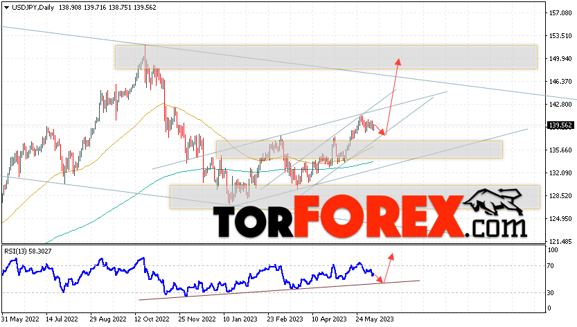 Дополнительным сигналом в пользу подъёма пары Доллар Иена на текущий торговой неделе выступит тест линии тренда на индикаторе относительной силы. Вторым сигналом станет отскок от нижней границы бычьего канала. Отменой варианта роста пары USD/JPY на текущей торговой неделе 12 — 16 июня 2023 выступит падение и пробой области 135.65. Такой вариант укажет на пробой области поддержки и продолжение падения пары на Форекс в область ниже уровня 132.45. Подтверждением росту по паре USD/JPY выступит пробой области сопротивления и закрытие цены над уровнем 142.85, что укажет на пробой верхней границы бычьего канала, а это сигнал к росту на ширину канала.