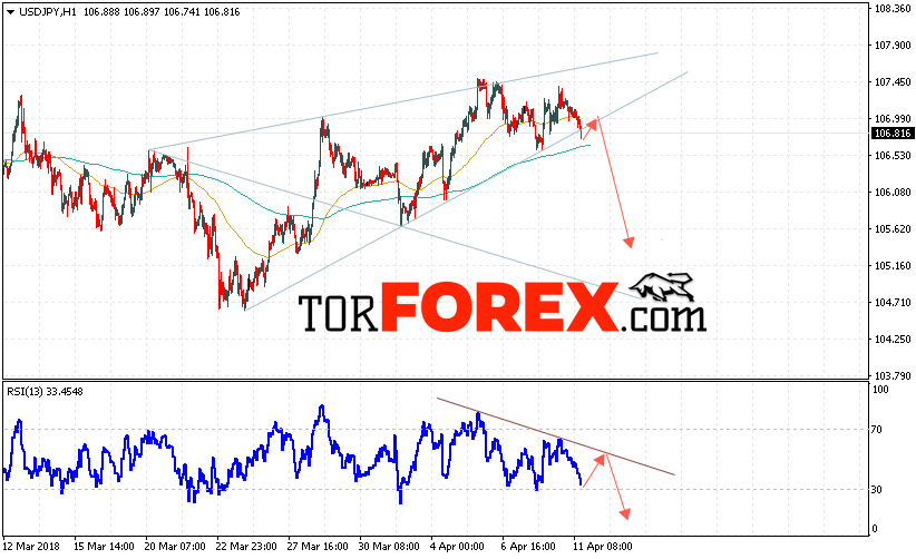 Таким образом, USD/JPY прогноз Доллар Иена на 12 апреля 2018 предполагает попытку теста уровня сопротивления вблизи области 107.10 и продолжения падения котировок в область ниже уровня 106.00, в пользу падения выступит тест линии сопротивления на индикаторе относительной силы, отменой варианта падения станет сильный рост и пробой области 108.10.