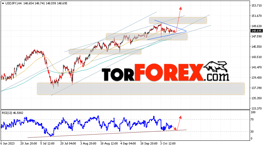 Котировки валютной пары Доллар Иена USD/JPY продолжают движение в рамках развития коррекции и формирования модели «Треугольник». В момент публикации прогноза курс Доллара США к Японской Иене составляет 148.69. Скользящие средние указывают на наличие краткосрочной бычьей тенденции по паре. Цены ушли вверх от области между сигнальными линиями, что указывает на давление со стороны покупателей Доллара США и потенциальное продолжение роста цен уже с текущих уровней. В рамках прогноза курса Японской Иены на 12 октября 2023 стоит ожидать попытку развития коррекции цены и тест области поддержки вблизи уровня 148.35. Далее, отскок цены вверх и продолжение роста пары USD/JPY в область выше уровня 153.65.