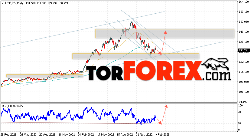 Дополнительным сигналом в пользу роста пары Доллар Иена на текущий торговой неделе выступит тест линии тренда на индикаторе относительной силы. Вторым сигналом станет отскок от нижней границы бычьего канала. Отменой варианта подъёма пары USD/JPY на текущей торговой неделе 13 — 17 февраля 2023 выступит падение и пробой области 122.25. Такой вариант укажет на пробой области поддержки и продолжение падения пары на Форекс в область ниже уровня 117.45. Подтверждением росту по паре USD/JPY выступит пробой области сопротивления и закрытие цены над уровнем 133.05, что укажет на пробой верхней границы нисходящего канала коррекции.