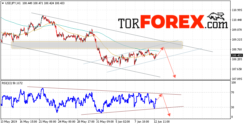 Котировки валютной пары Доллар Иена USD/JPY продолжают движение в рамках коррекции и нисходящего канала. В момент публикации прогноза курс Доллара США к Японской Иене составляет 108.43. Скользящие средние указывают на наличие краткосрочной нисходящей тенденции по паре. В рамках прогноза курса Японской Иены на 13 июня 2019 стоит ожидать попытку роста и тест области сопротивления вблизи уровня 108.75. Далее, отскок и продолжение падения пары USD/JPY в область ниже уровня 107.10.