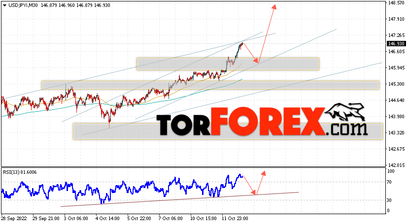 Котировки валютной пары Доллар Иена USD/JPY продолжают движение в рамках роста и бычьего канала. В момент публикации прогноза курс Доллара США к Японской Иене составляет 146.93. Скользящие средние указывают на наличие краткосрочной бычьей тенденции по паре. Цены пробили область между сигнальными линиями вверх, что указывает на давление со стороны покупателей Доллара США и потенциальное продолжение роста цен уже с текущих уровней. В рамках прогноза курса Японской Иены на 13 октября 2022 стоит ожидать попытку развития незначительной коррекции и тест области поддержки вблизи уровня 146.35. Далее, отскок цены вверх и продолжение роста пары USD/JPY в область выше уровня 148.45.