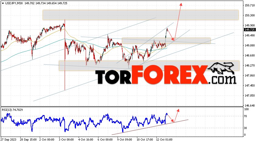 Котировки валютной пары Доллар Иена USD/JPY продолжают движение в рамках развития роста и бычьего канала. В момент публикации прогноза курс Доллара США к Японской Иене составляет 149.72. Скользящие средние указывают на наличие краткосрочной бычьей тенденции по паре. Цены ушли вверх от области между сигнальными линиями, что указывает на давление со стороны покупателей Доллара США и потенциальное продолжение роста цен уже с текущих уровней. В рамках прогноза курса Японской Иены на 13 октября 2023 стоит ожидать попытку развития коррекции цены и тест области поддержки вблизи уровня 149.25. Далее, отскок цены вверх и продолжение роста пары USD/JPY в область выше уровня 150.85.