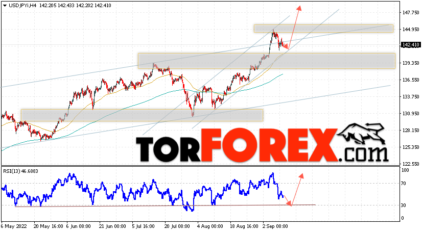 Котировки валютной пары Доллар Иена USD/JPY продолжают движение в коррекции после сильного роста цены и бычьего канала. В момент публикации прогноза курс Доллара США к Японской Иене составляет 142.41. Скользящие средние указывают на наличие краткосрочной бычьей тенденции по паре. Цены пробили область между сигнальными линиями вверх, что указывает на давление со стороны покупателей Доллара США и потенциальное продолжение роста цен уже с текущих уровней. В рамках прогноза курса Японской Иены на 13 сентября 2022 стоит ожидать попытку развития незначительной коррекции и тест области поддержки вблизи уровня 141.05. Далее, отскок цены вверх и продолжение роста пары USD/JPY в область выше уровня 150.05.