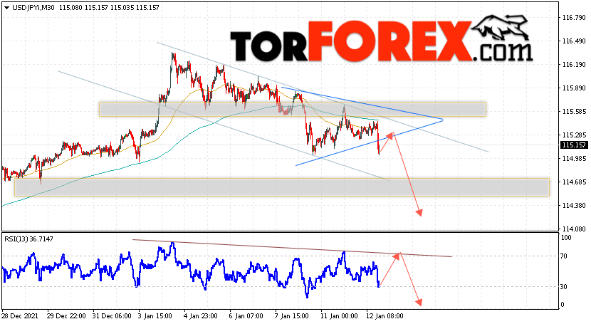 Котировки валютной пары Доллар Иена USD/JPY продолжают движение в рамках падения и нисходящего канала. В момент публикации прогноза курс Доллара США к Японской Иене составляет 115.15. Скользящие средние указывают на наличие краткосрочной медвежьей тенденции по паре. Цены пробили область между сигнальными линиями вниз, что указывает на давление со стороны продавцов Доллара США и потенциальное продолжение падения цен уже с текущих уровней. В рамках прогноза курса Японской Иены на 13 января 2022 стоит ожидать попытку развития коррекции и тест области сопротивления вблизи уровня 115.25. Далее, отскок цены вниз и продолжение падения пары USD/JPY в область ниже уровня 113.85.