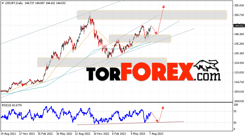 Дополнительным сигналом в пользу подъёма пары Доллар Иена на текущий торговой неделе выступит тест линии тренда на индикаторе относительной силы, сейчас значения индикатора приблизились к линии сопротивления. Вторым сигналом станет отскок от нижней границы бычьего канала. Отменой варианта роста пары USD/JPY на текущей торговой неделе 14 — 18 августа 2023 выступит падение и пробой области 134.85. Такой вариант укажет на пробой области поддержки и продолжение падения пары на Форекс в область ниже уровня 132.65. Подтверждением росту по паре USD/JPY выступит пробой области сопротивления и закрытие цены над уровнем 145.75.