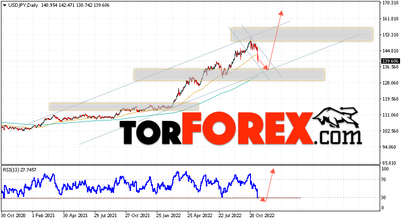 Дополнительным сигналом в пользу роста пары Доллар Иена на текущий торговой неделе выступит тест бычьей линии тренда на индикаторе относительной силы. Вторым сигналом станет отскок от нижней границы бычьего канала. Отменой варианта подъёма пары USD/JPY на текущей торговой неделе 14 — 18 ноября 2022 выступит падение и пробой области 133.15. Такой вариант укажет на пробой области поддержки и продолжение падения пары на Форекс в область ниже уровня 129.25. Подтверждением росту по паре USD/JPY выступит пробой области сопротивления и закрытие цены над уровнем 144.75, что укажет на пробой верхней границы нисходящего канала коррекции.