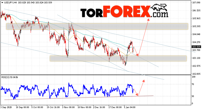 Таким образом, USD/JPY прогноз Доллар Иена на 14 января 2021 предполагает попытку теста области поддержки вблизи уровня 103.35. Затем, продолжение роста котировок в область выше уровня 105.95. В пользу подъёма пары выступит тест линии тренда на индикаторе относительной силы. Отменой варианта роста станет падение и пробой области 102.35. Это укажет на пробой уровня поддержки и продолжение падения по паре с потенциальной целью ниже уровня 100.25.