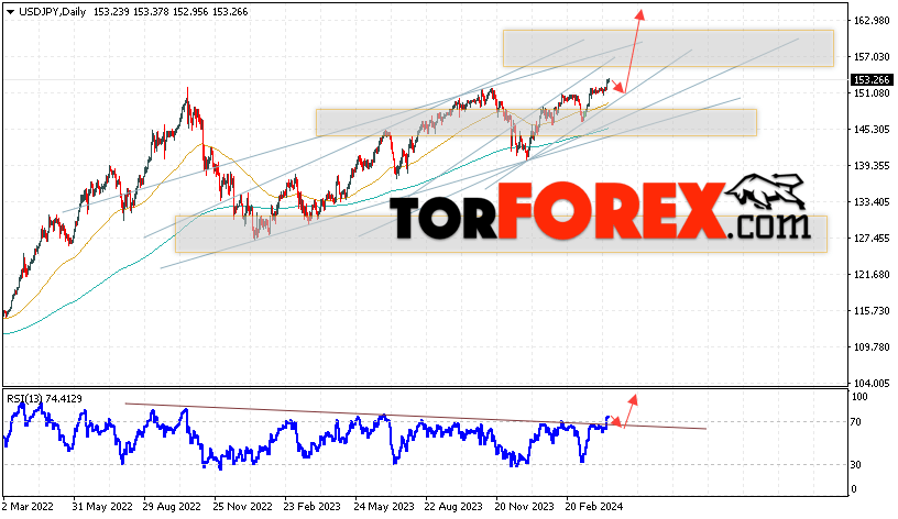 Дополнительным сигналом в пользу падения пары Доллар Иена на текущий торговой неделе выступит тест бычьей линии тренда на индикаторе относительной силы. Вторым сигналом станет отскок от нижней границы восходящего канала. Отменой варианта роста пары USD/JPY на текущей торговой неделе 15 — 19 апреля 2024 выступит падение и пробой области 144.75. Такой вариант укажет на пробой области поддержки и продолжение падения пары на Форекс в область ниже уровня 141.65. Подтверждением росту по паре USD/JPY выступит пробой области сопротивления и закрытие цены над уровнем 154.05.