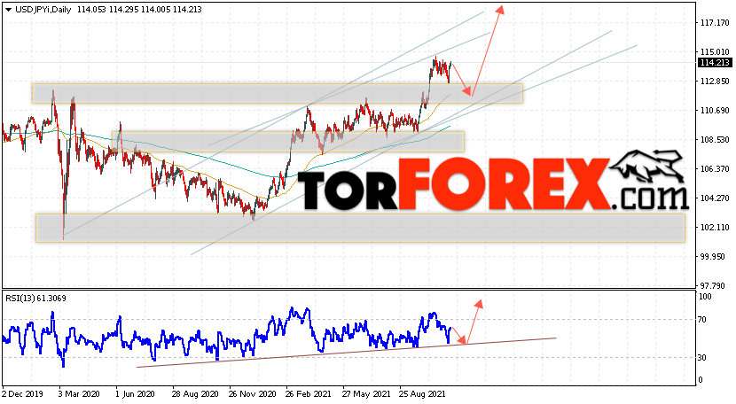 Дополнительным сигналом в пользу подъёма пары Доллар Иена на текущий торговой неделе выступит тест восходящей линии тренда на индикаторе относительной силы. Вторым сигналом станет отскок от нижней границы бычьего канала. Отменой варианта подъёма пары USD/JPY на текущей торговой неделе 15 — 19 ноября 2021 выступит падение и пробой области 108.65. Такой вариант укажет на пробой области поддержки и продолжение падения пары на Форекс в область ниже уровня 106.15. Подтверждением подъёма по паре USD/JPY выступит пробой области сопротивления и закрытие цены над уровнем 115.65.