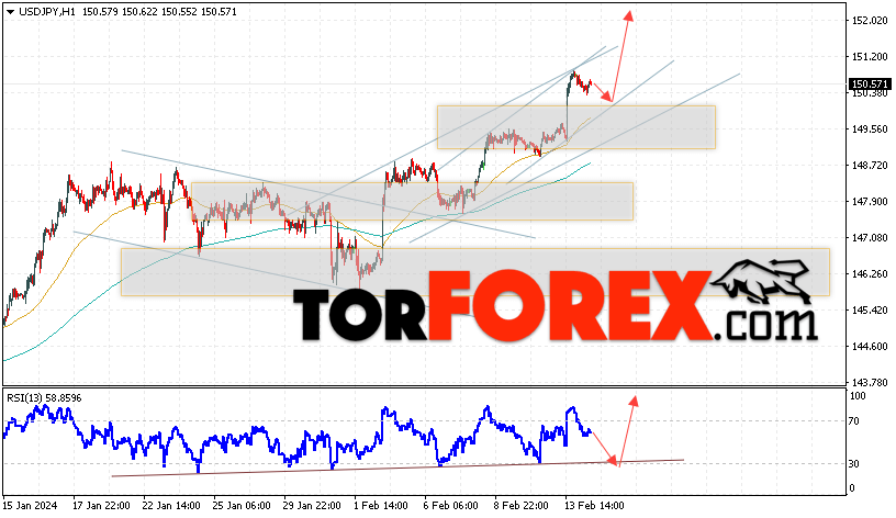 Котировки валютной пары Доллар Иена USD/JPY продолжают движение в рамках развития роста и бычьего канала. В момент публикации прогноза курс Доллара США к Японской Иене составляет 150.57. Скользящие средние указывают на наличие краткосрочной бычьей тенденции по паре. Цены пробили область между сигнальными линиями вверх, что указывает на давление со стороны покупателей Доллара США и потенциальное продолжение роста цен уже с текущих уровней. В рамках прогноза курса Японской Иены на 15 февраля 2024 стоит ожидать попытку развития коррекции цены и тест области поддержки вблизи уровня 150.05. Далее, отскок цены вверх и продолжение роста пары USD/JPY в область выше уровня 152.15.