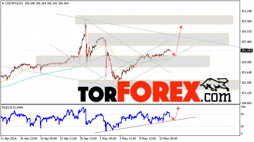 Котировки валютной пары Доллар Иена USD/JPY продолжают движение в рамках развития роста и бычьего канала. В момент публикации прогноза курс Доллара США к Японской Иене составляет 156.36. Скользящие средние указывают на наличие краткосрочной бычьей тенденции по паре. Цены пробили область между сигнальными линиями вверх, что указывает на давление со стороны покупателей Доллара США и потенциальное продолжение роста цен уже с текущих уровней. В рамках прогноза курса Японской Иены на 15 мая 2024 стоит ожидать попытку развития снижения цены и тест области поддержки вблизи уровня 155.25. Далее, отскок цены вверх и продолжение роста пары USD/JPY в область выше уровня 159.05.
