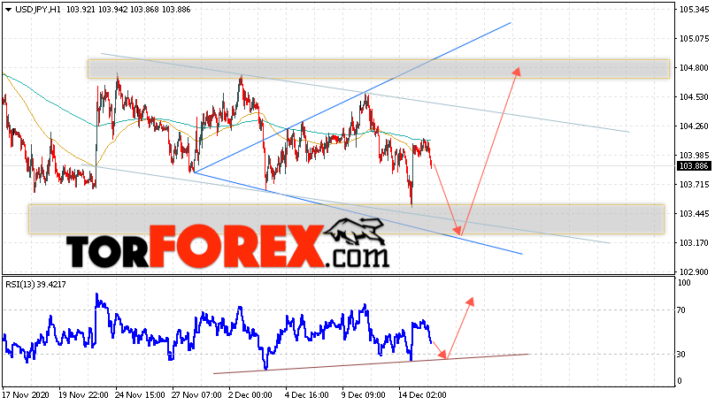 Котировки валютной пары Доллар Иена USD/JPY продолжают движение в рамках коррекции и формирования бычьей модели ”Волна Вульфа”. В момент публикации прогноза курс Доллара США к Японской Иене составляет 103.88. Скользящие средние указывают на наличие краткосрочной медвежьей тенденции по паре. Цены ушли вниз от области между сигнальными линиями, что указывает на давление со стороны продавцов Доллара США и потенциальное продолжение падения цен уже с текущих уровней. В рамках прогноза курса Японской Иены на 16 декабря 2020 стоит ожидать попытку развития коррекции и тест области поддержки вблизи уровня 103.20. Далее, отскок и продолжение подъёма пары USD/JPY в область выше уровня 104.75.