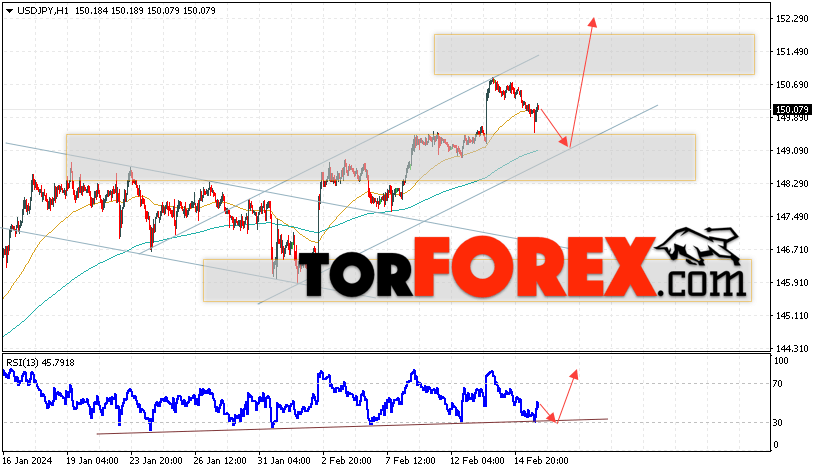 Котировки валютной пары Доллар Иена USD/JPY продолжают движение в рамках развития роста и бычьего канала. В момент публикации прогноза курс Доллара США к Японской Иене составляет 150.07. Скользящие средние указывают на наличие краткосрочной бычьей тенденции по паре. Цены пробили область между сигнальными линиями вверх, что указывает на давление со стороны покупателей Доллара США и потенциальное продолжение роста цен уже с текущих уровней. В рамках прогноза курса Японской Иены на 16 февраля 2024 стоит ожидать попытку развития коррекции цены и тест области поддержки вблизи уровня 149.25. Далее, отскок цены вверх и продолжение роста пары USD/JPY в область выше уровня 152.45.