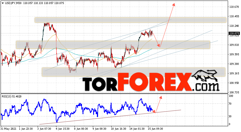 Котировки валютной пары Доллар Иена USD/JPY продолжают движение в рамках коррекции и восходящего канала. В момент публикации прогноза курс Доллара США к Японской Иене составляет 110.07. Скользящие средние указывают на наличие краткосрочной бычьей тенденции по паре. Цены ушли вверх от области между сигнальными линиями, что указывает на давление со стороны покупателей Доллара США и потенциальное продолжение роста цен уже с текущих уровней. В рамках прогноза курса Японской Иены на 16 июня 2021 стоит ожидать попытку развития коррекции и тест области поддержки вблизи уровня 109.55. Далее, отскок и продолжение роста пары USD/JPY в область выше уровня 110.85.