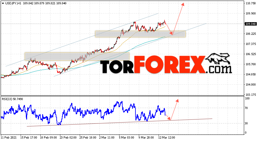 Котировки валютной пары Доллар Иена USD/JPY продолжают движение в рамках роста и восходящего канала. В момент публикации прогноза курс Доллара США к Японской Иене составляет 109.04. Скользящие средние указывают на наличие краткосрочной бычьей тенденции по паре. Цены ушли вверх от области между сигнальными линиями, что указывает на давление со стороны покупателей Доллара США и потенциальное продолжение подъёма цен уже с текущих уровней. В рамках прогноза курса Японской Иены на 16 марта 2021 стоит ожидать попытку развития коррекции и тест области поддержки вблизи уровня 108.15. Далее, отскок и продолжение подъёма пары USD/JPY в область выше уровня 110.85.