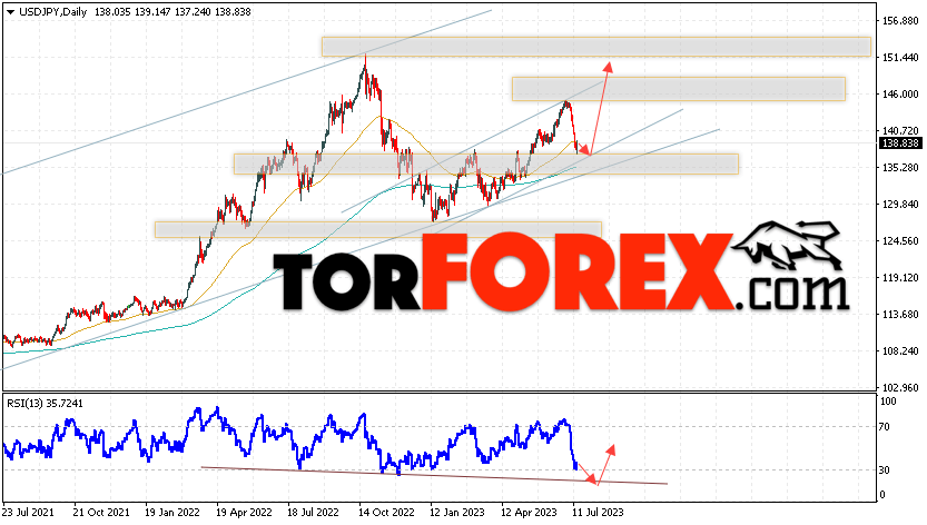 Дополнительным сигналом в пользу подъёма пары Доллар Иена на текущий торговой неделе выступит тест линии тренда на индикаторе относительной силы. Вторым сигналом станет отскок от нижней границы бычьего канала. Отменой варианта роста пары USD/JPY на текущей торговой неделе 17 — 21 июля 2023 выступит падение и пробой области 134.45. Такой вариант укажет на пробой области поддержки и продолжение падения пары на Форекс в область ниже уровня 132.35. Подтверждением росту по паре USD/JPY выступит пробой области сопротивления и закрытие цены над уровнем 141.05.