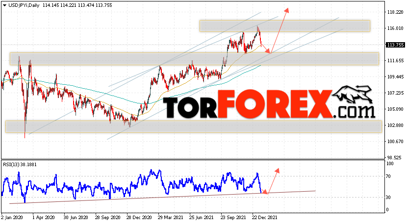 Дополнительным сигналом в пользу подъёма пары Доллар Иена на текущий торговой неделе выступит тест бычьей линии тренда на индикаторе относительной силы. Вторым сигналом станет отскок от нижней границы восходящего канала. Отменой варианта роста пары USD/JPY на текущей торговой неделе 17 — 21 января 2022 выступит падение и пробой области 110.55. Такой вариант укажет на пробой области поддержки и продолжение падения пары на Форекс в область ниже уровня 107.65. Подтверждением подъёму по паре USD/JPY выступит пробой области поддержки и закрытие цены под уровнем 116.45.
