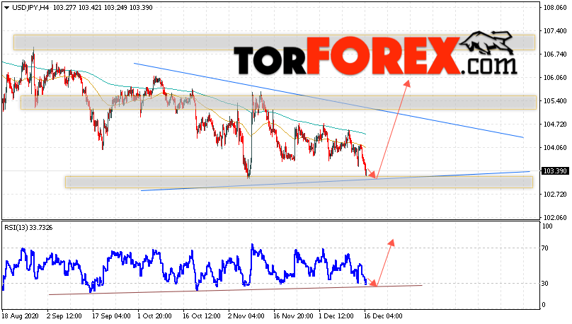 Таким образом, USD/JPY прогноз Доллар Иена на 17 декабря 2020 предполагает попытку теста области поддержки вблизи уровня 103.05. Затем, продолжение роста котировок в область выше уровня 106.05. В пользу подъёма пары выступит тест линии тренда на индикаторе относительной силы. Отменой варианта роста станет падение и пробой области 102.55. Это укажет на пробой уровня поддержки и продолжение падения по паре с потенциальной целью ниже уровня 99.55.