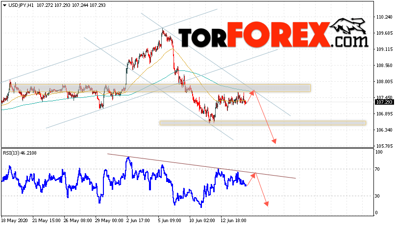 Дополнительным сигналом в пользу падения валютной пары USD/JPY выступит тест линии сопротивления на индикаторе относительной силы. Вторым сигналом станет отскок от верхней границы нисходящего канала. Отменой варианта падения валютной пары Доллар Иена станет сильный рост и пробой уровня 108.05. Это укажет на пробой области сопротивления и продолжение роста пары Доллар Иена. В этом случае стоит ожидать продолжение подъёма пары в область выше уровня 111.25. С пробоем области поддержки и закрытием котировок ниже уровня 106.45 стоит ожидать подтверждения развития нисходящего движения по паре.