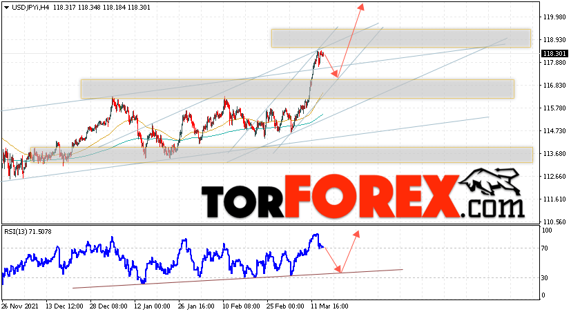 Таким образом, USD/JPY прогноз Доллар Иена на 17 марта 2022 предполагает попытку теста области поддержки вблизи уровня 117.25. Затем, продолжение роста котировок в область выше уровня 120.45. В пользу подъёма пары выступит тест линии тренда на индикаторе относительной силы. Отменой варианта роста станет падение и пробой области 116.25. Это укажет на пробой уровня поддержки и продолжение падения по паре с потенциальной целью ниже уровня 115.05.