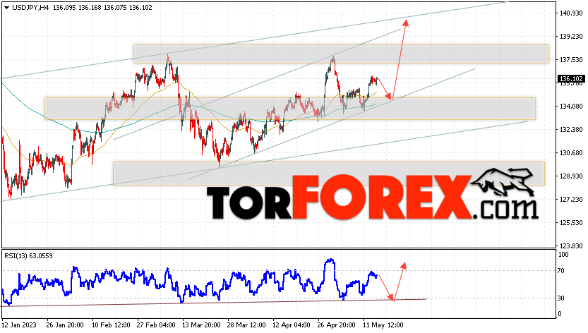 Котировки валютной пары Доллар Иена USD/JPY продолжают движение в рамках роста и бычьего канала. В момент публикации прогноза курс Доллара США к Японской Иене составляет 136.10. Скользящие средние указывают на наличие краткосрочной бычьей тенденции по паре. Цены пробили область между сигнальными линиями вверх, что указывает на давление со стороны покупателей Доллара США и потенциальное продолжение роста цен уже с текущих уровней. В рамках прогноза курса Японской Иены на 17 мая 2023 стоит ожидать попытку развития коррекции цены и тест области поддержки вблизи уровня 134.65. Далее, отскок цены вверх и продолжение роста пары USD/JPY в область выше уровня 139.75.