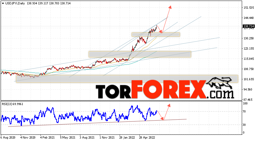 Дополнительным сигналом в пользу роста пары Доллар Иена на текущий торговой неделе выступит тест бычьей линии тренда на индикаторе относительной силы. Вторым сигналом станет отскок от нижней границы бычьего канала. Отменой варианта подъёма пары USD/JPY на текущей торговой неделе 18 — 22 июля 2022 выступит падение и пробой области 129.05. Такой вариант укажет на пробой области поддержки и продолжение падения пары на Форекс в область ниже уровня 126.65. Подтверждением росту по паре USD/JPY выступит пробой области сопротивления и закрытие цены над уровнем 140.65, что укажет на пробой очередного бычьего канала вверх, а это сильный сигнал к покупок пары.