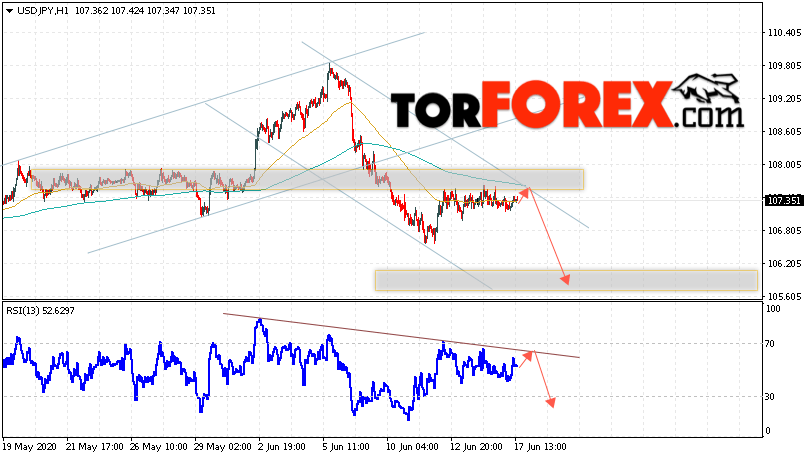 Дополнительным сигналом в пользу падения валютной пары USD/JPY выступит тест линии сопротивления на индикаторе относительной силы. Вторым сигналом станет отскок от верхней границы нисходящего канала. Отменой варианта падения валютной пары Доллар Иена станет сильный рост и пробой уровня 108.15. Это укажет на пробой области сопротивления и продолжение роста пары Доллар Иена. В этом случае стоит ожидать продолжение подъёма пары в область выше уровня 111.25. С пробоем области поддержки и закрытием котировок ниже уровня 106.45 стоит ожидать подтверждения развития нисходящего движения по паре.