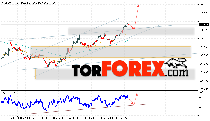 Котировки валютной пары Доллар Иена USD/JPY продолжают движение в рамках развития роста и бычьего канала. В момент публикации прогноза курс Доллара США к Японской Иене составляет 147.62. Скользящие средние указывают на наличие краткосрочной бычьей тенденции по паре. Цены пробили область между сигнальными линиями вверх, что указывает на давление со стороны покупателей Доллара США и потенциальное продолжение роста цен уже с текущих уровней. В рамках прогноза курса Японской Иены на 18 января 2024 стоит ожидать попытку развития коррекции цены и тест области поддержки вблизи уровня 146.75. Далее, отскок цены вверх и продолжение роста пары USD/JPY в область выше уровня 150.95.
