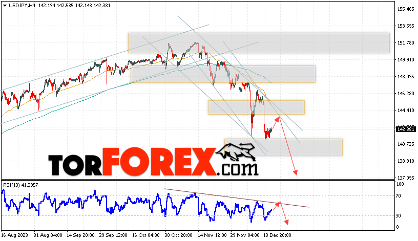 Котировки валютной пары Доллар Иена USD/JPY продолжают движение в рамках развития коррекции и нисходящего канала. В момент публикации прогноза курс Доллара США к Японской Иене составляет 142.38. Скользящие средние указывают на наличие краткосрочной медвежьей тенденции по паре. Цены пробили область между сигнальными линиями вниз, что указывает на давление со стороны продавцов Доллара США и потенциальное продолжение падения цен уже с текущих уровней. В рамках прогноза курса Японской Иены на 19 декабря 2023 стоит ожидать попытку развития подъёма цены и тест области сопротивления вблизи уровня 143.45. Далее, отскок цены вниз и продолжение падения пары USD/JPY в область ниже уровня 137.45.