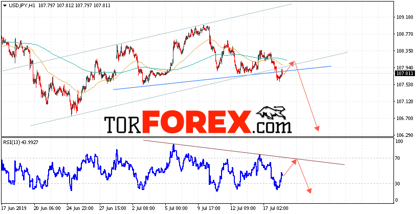 Котировки валютной пары Доллар Иена USD/JPY продолжают движение в рамках коррекции. В момент публикации прогноза курс Доллара США к Японской Иене составляет 107.81. Скользящие средние указывают на наличие краткосрочной нисходящей тенденции по паре. В рамках прогноза курса Японской Иены на 19 июля 2019 стоит ожидать попытку роста и тест области сопротивления вблизи уровня 107.95. Далее, отскок и продолжение снижения пары USD/JPY в область ниже уровня 106.30.