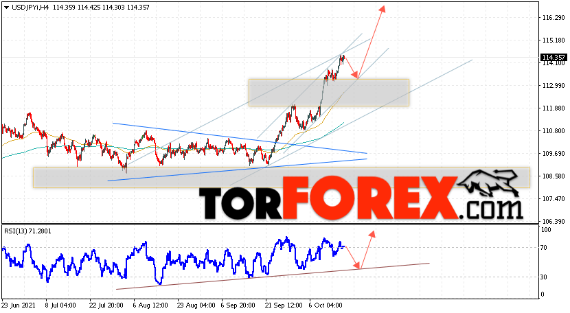 Котировки валютной пары Доллар Иена USD/JPY продолжают движение в рамках подъёма и бычьего канала. В момент публикации прогноза курс Доллара США к Японской Иене составляет 114.35. Скользящие средние указывают на наличие краткосрочной бычьей тенденции по паре. Цены пробили область между сигнальными линиями вверх, что указывает на давление со стороны покупателей Доллара США и потенциальное продолжение подъёма цен уже с текущих уровней. В рамках прогноза курса Японской Иены на 19 октября 2021 стоит ожидать попытку развития коррекции и тест области поддержки вблизи уровня 113.35. Далее, отскок вверх и продолжение подъёма пары USD/JPY в область выше уровня 116.65.