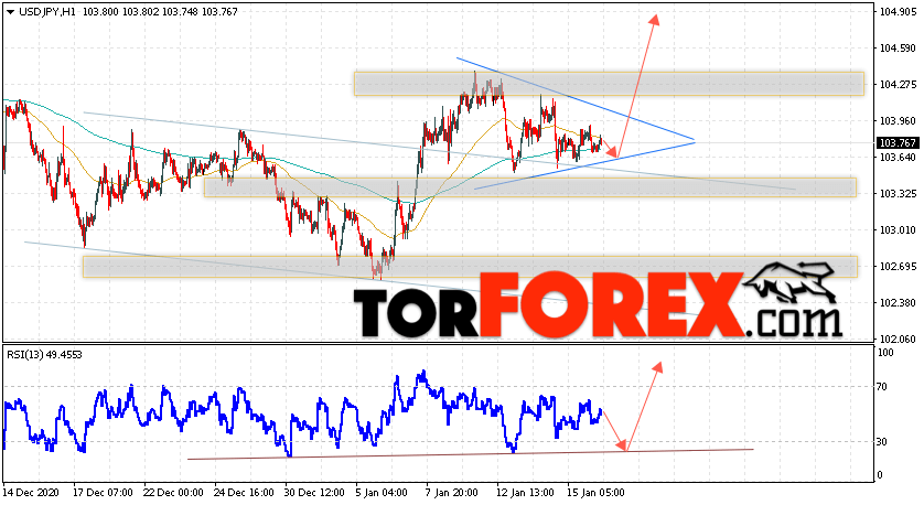 Таким образом, USD/JPY прогноз Доллар Иена на 19 января 2021 предполагает попытку теста области поддержки вблизи уровня 103.65. Затем, продолжение роста котировок в область выше уровня 104.95. В пользу подъёма пары выступит тест линии тренда на индикаторе относительной силы. Отменой варианта роста станет падение и пробой области 103.25. Это укажет на пробой уровня поддержки и продолжение падения по паре с потенциальной целью ниже уровня 100.55.