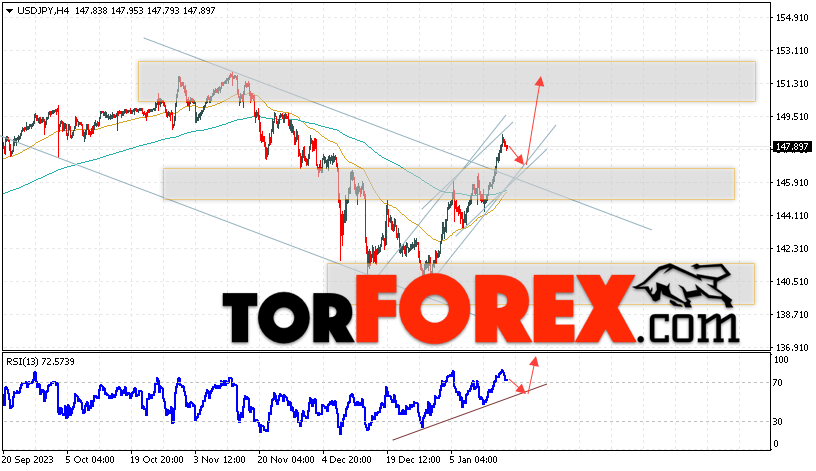 Котировки валютной пары Доллар Иена USD/JPY продолжают движение в рамках развития роста и бычьего канала. В момент публикации прогноза курс Доллара США к Японской Иене составляет 147.89. Скользящие средние указывают на наличие краткосрочной бычьей тенденции по паре. Цены пробили область между сигнальными линиями вверх, что указывает на давление со стороны покупателей Доллара США и потенциальное продолжение роста цен уже с текущих уровней. В рамках прогноза курса Японской Иены на 19 января 2024 стоит ожидать попытку развития коррекции цены и тест области поддержки вблизи уровня 146.45. Далее, отскок цены вверх и продолжение роста пары USD/JPY в область выше уровня 151.45.