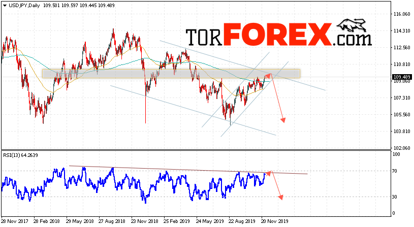 В пользу снижения пары Доллар Иена выступит тест линии сопротивления на индикаторе относительной силы. Вторым сигналом станет отскок от верхней границы нисходящего канала. Отменой варианта падения пары USD/JPY на текущей торговой неделе 2 — 6 декабря 2019 выступит сильный рост и пробой области 110.85. Такой вариант укажет на пробой области сопротивления и продолжение роста пары на Форекс в область выше уровня 113.15. Подтверждением падения по паре USD/JPY выступит пробой нижней границы восходящего канала и закрытие под уровнем 107.25.